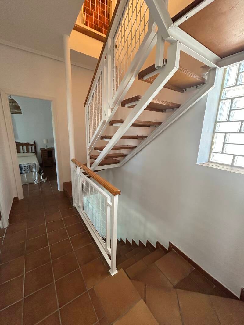 En la primera planta encontramos 3 habitaciones, comenzando con 1 de matrimonio con enorme ventanal de paso y terraza que comunica con otra de 2 camas individuales, y otra habitación con mueble litera plegable. Encontramos también en esta planta un renovado y enorme baño con plato de ducha.