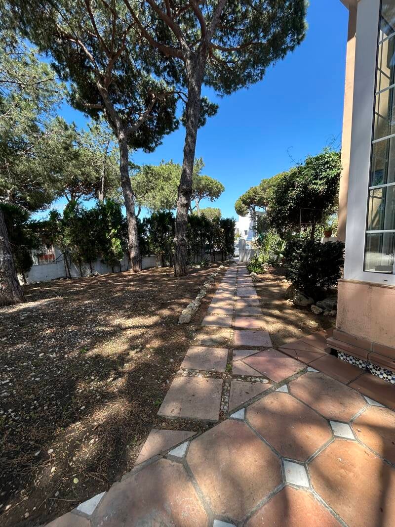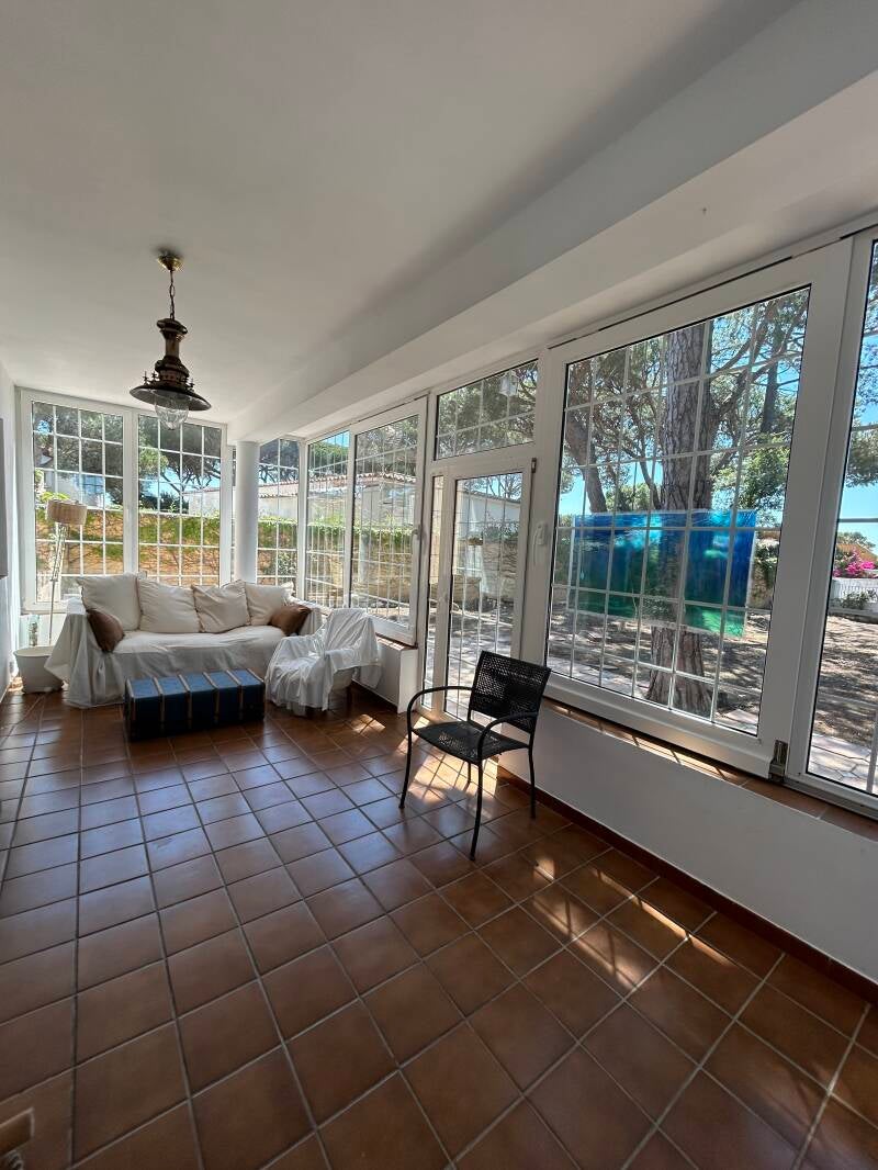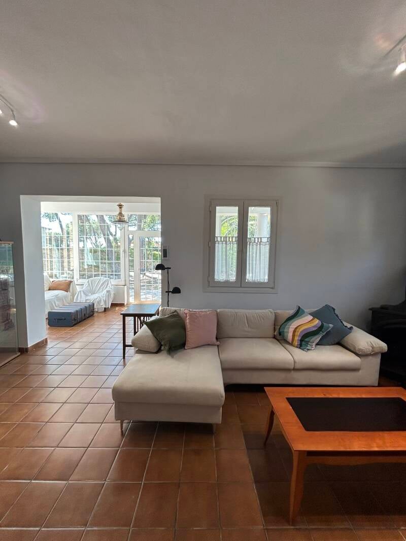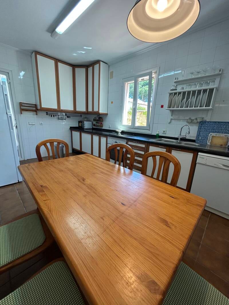 La planta baja consta de un enorme jardín que rodea la vivienda, con zona chill out de descanso y ocio, donde al mismo tiempo que se escucha el cantar de los pájaros, nos llega el aroma de la brisa marina. Este jardín está comunicado con una luminosa terraza acristalada y amueblada a la vez conectada con el interior de la casa. También en planta baja, tenemos un nuevo y elegante salón, una amplia y funcional cocina con todo lo necesario incluyendo mesa comedor, y un pequeño aseo auxiliar.