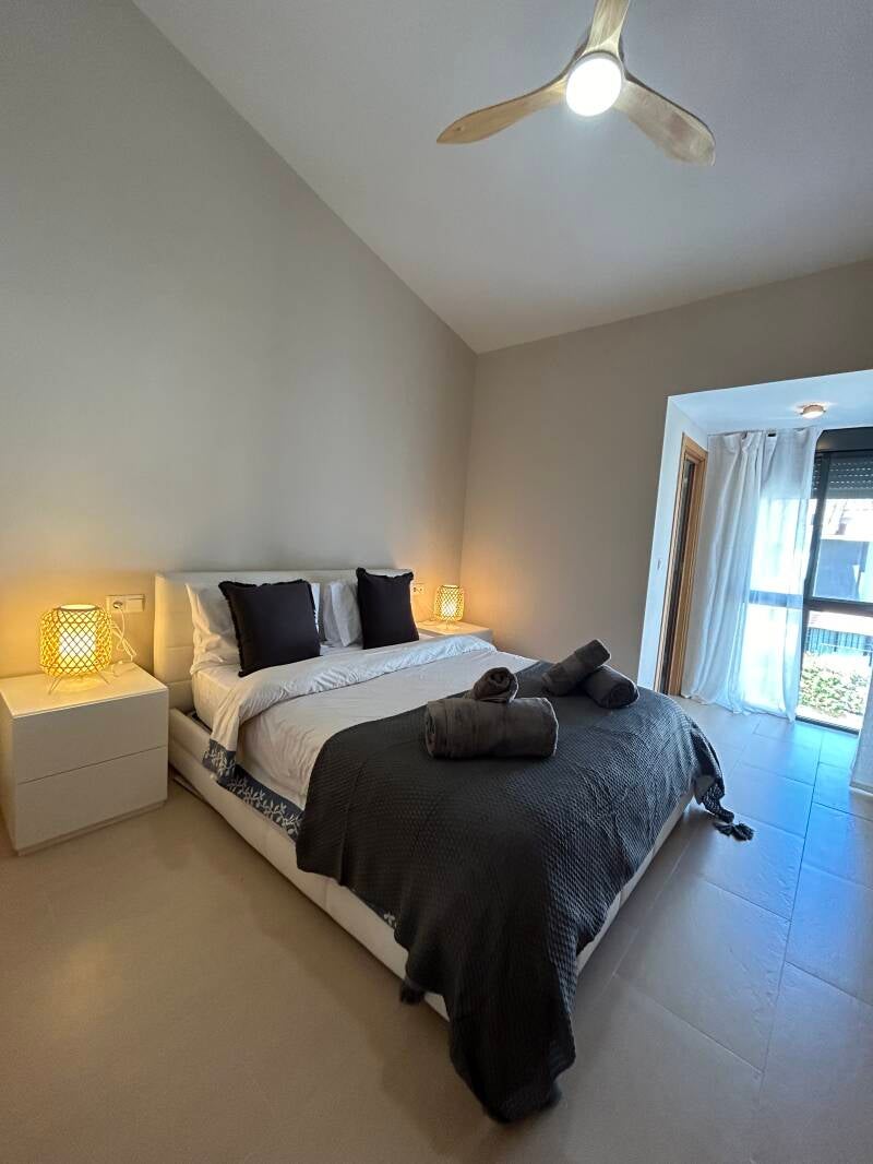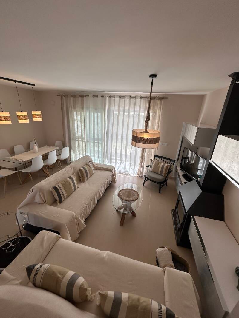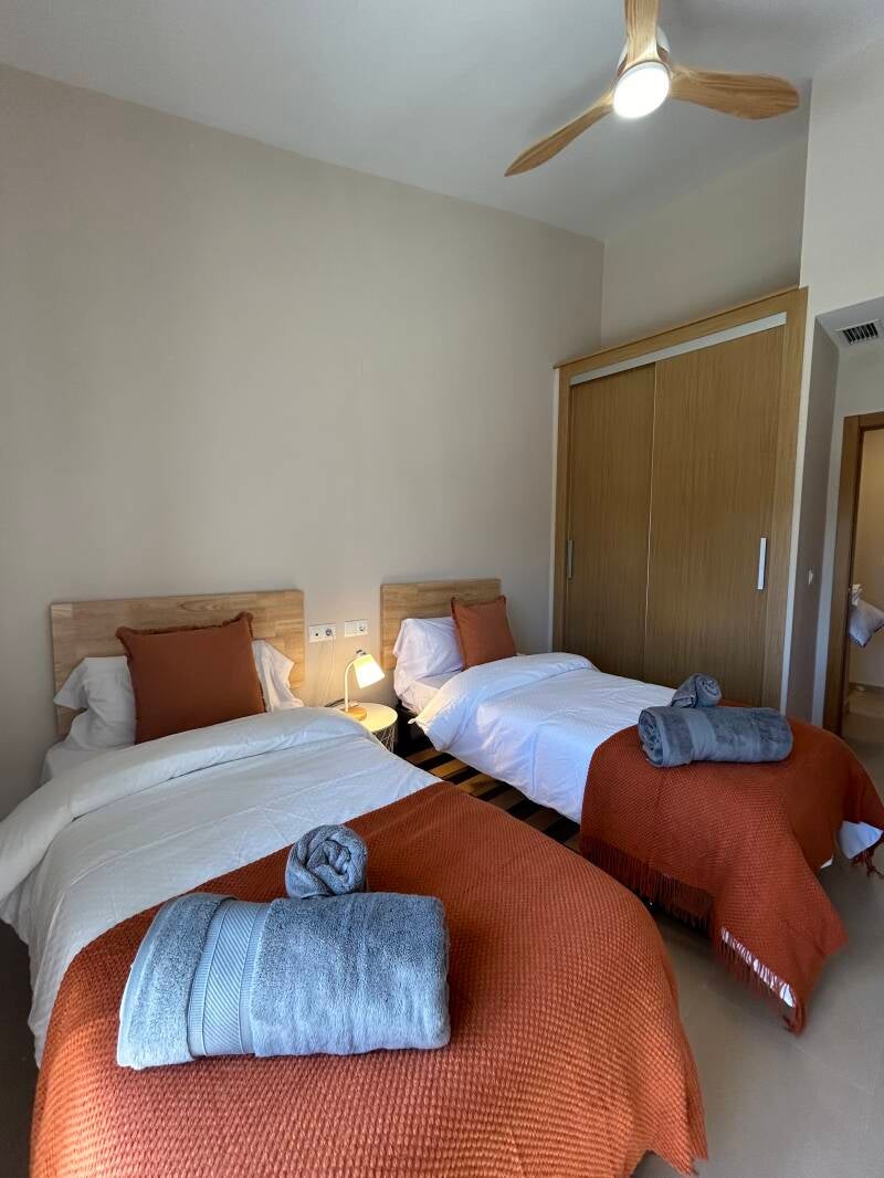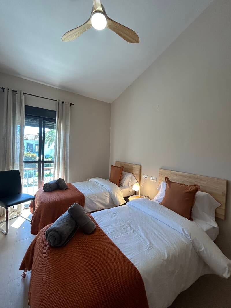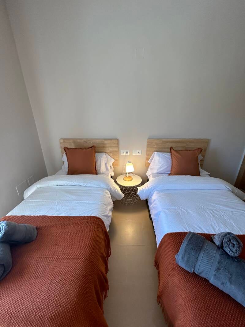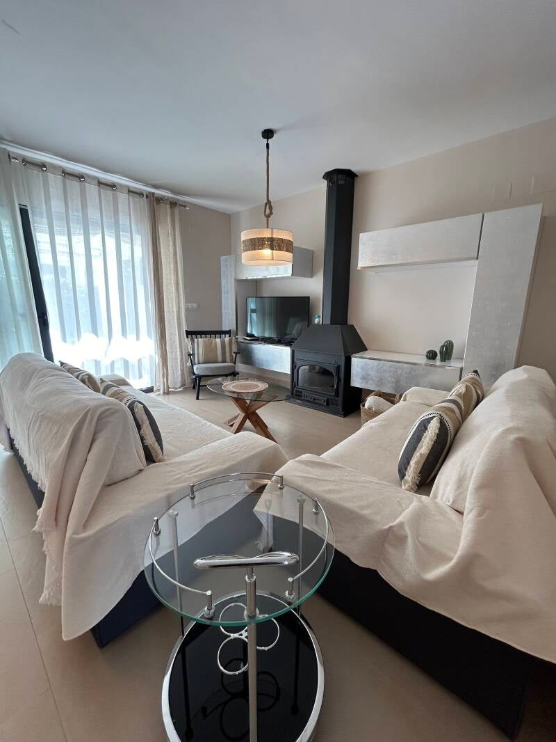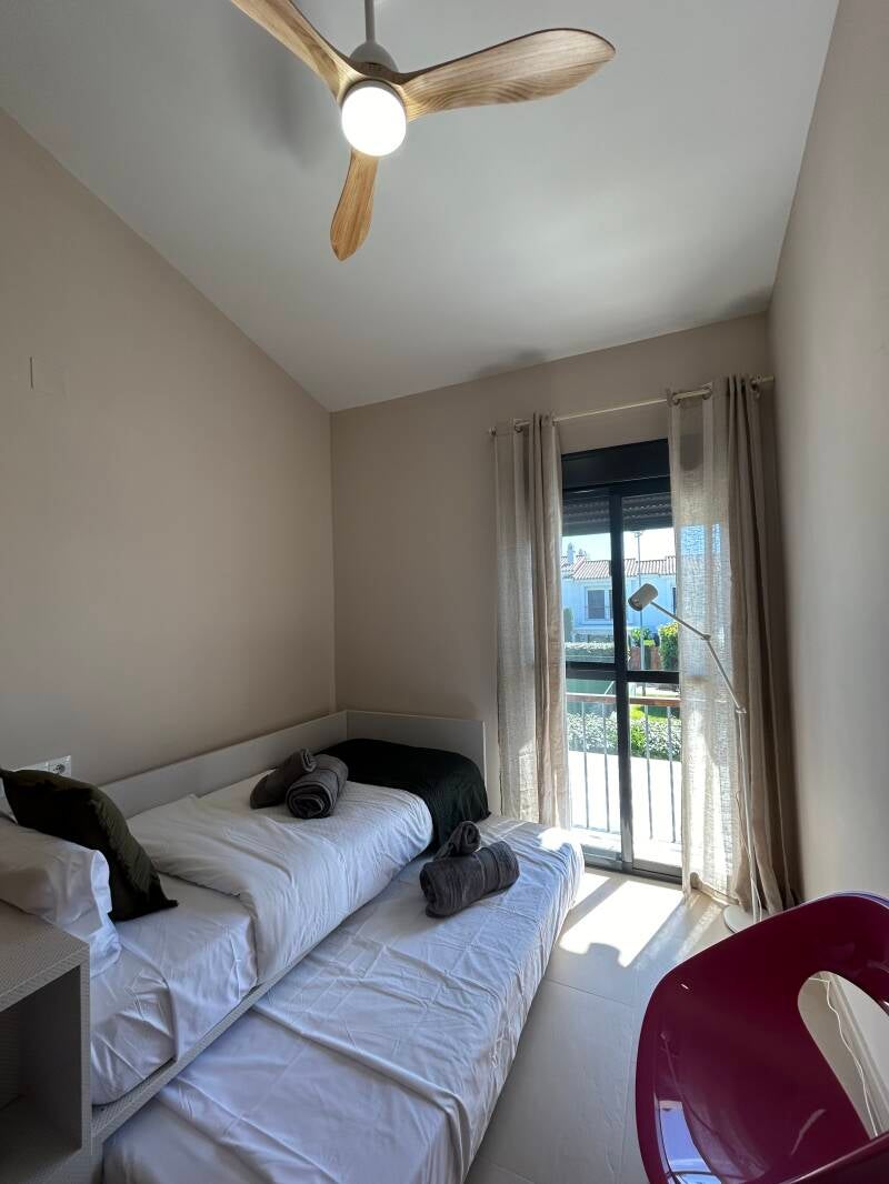 Capacidad para hasta 6 personas, ofreciendo 3 habitaciones (1 con cama de matrimonio, otra con 2 camas individuales y otra con cama individual y cama nido) y 3 baños (uno de ellos en suit en la habitación de matrimonio). Casa completamente amueblada, con amplio y luminoso salón comunicado con una preciosa terraza veraniega amueblada. La cocina cuenta con todo al detalle y se ofrece juego de toalla y sábanas a nuestros huéspedes.