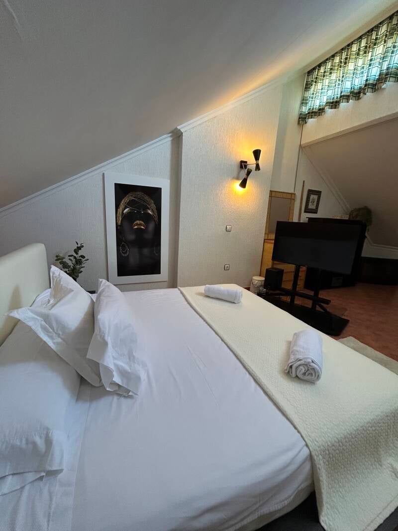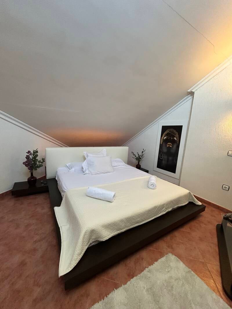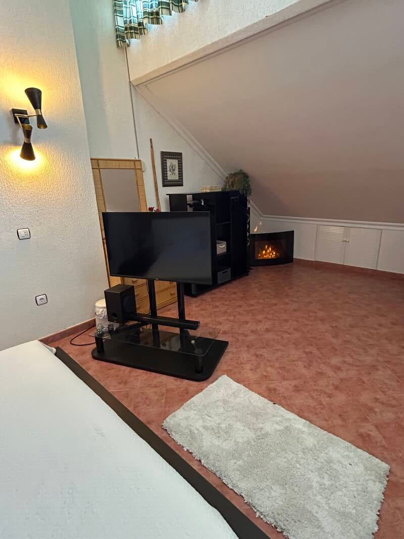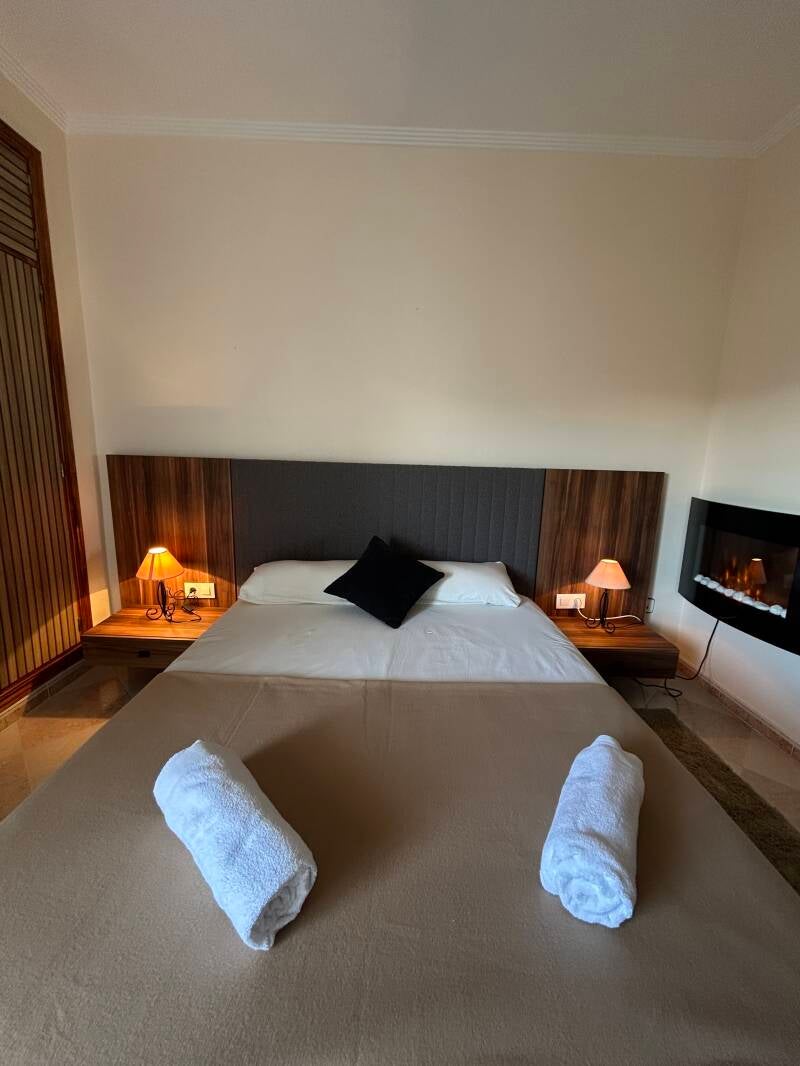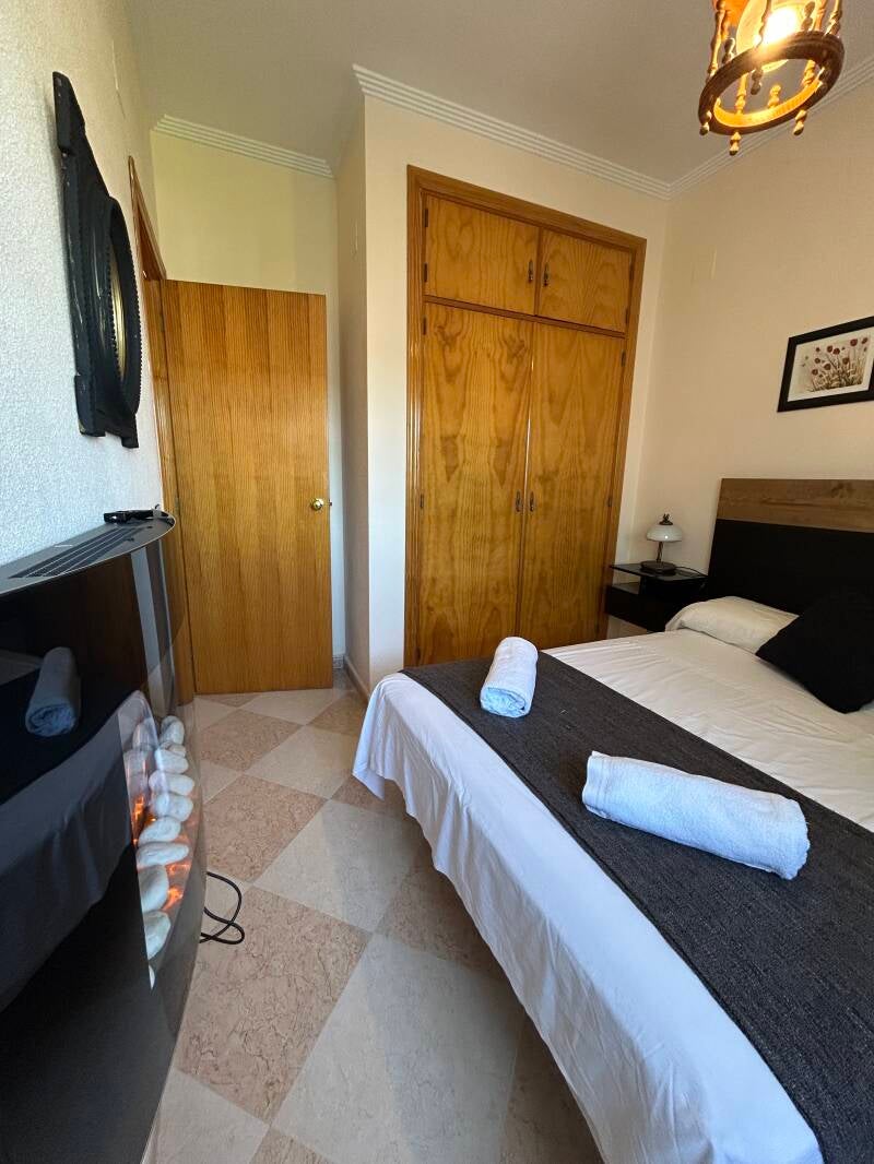 En la tercera y última planta nos topamos con el ático reconvertido en una habitación enorme, amplia y luminosa, con una impresionante cama de 2x2, otra estufa simulador de chimenea y aire acondicionado.