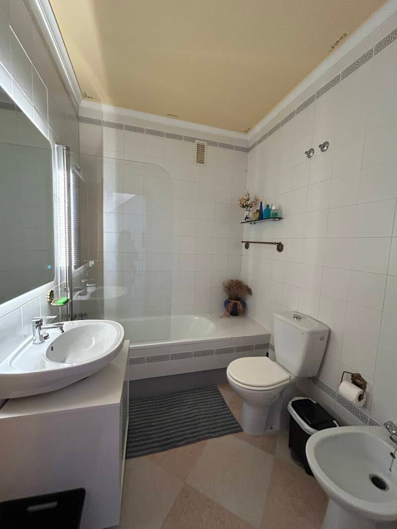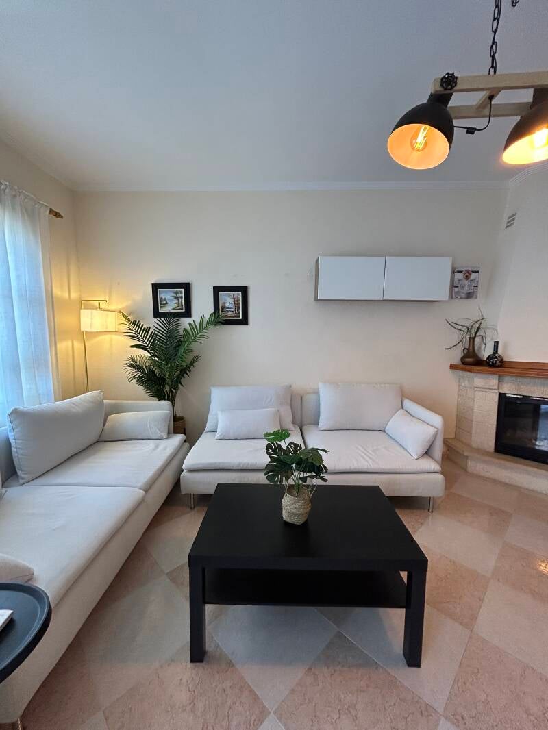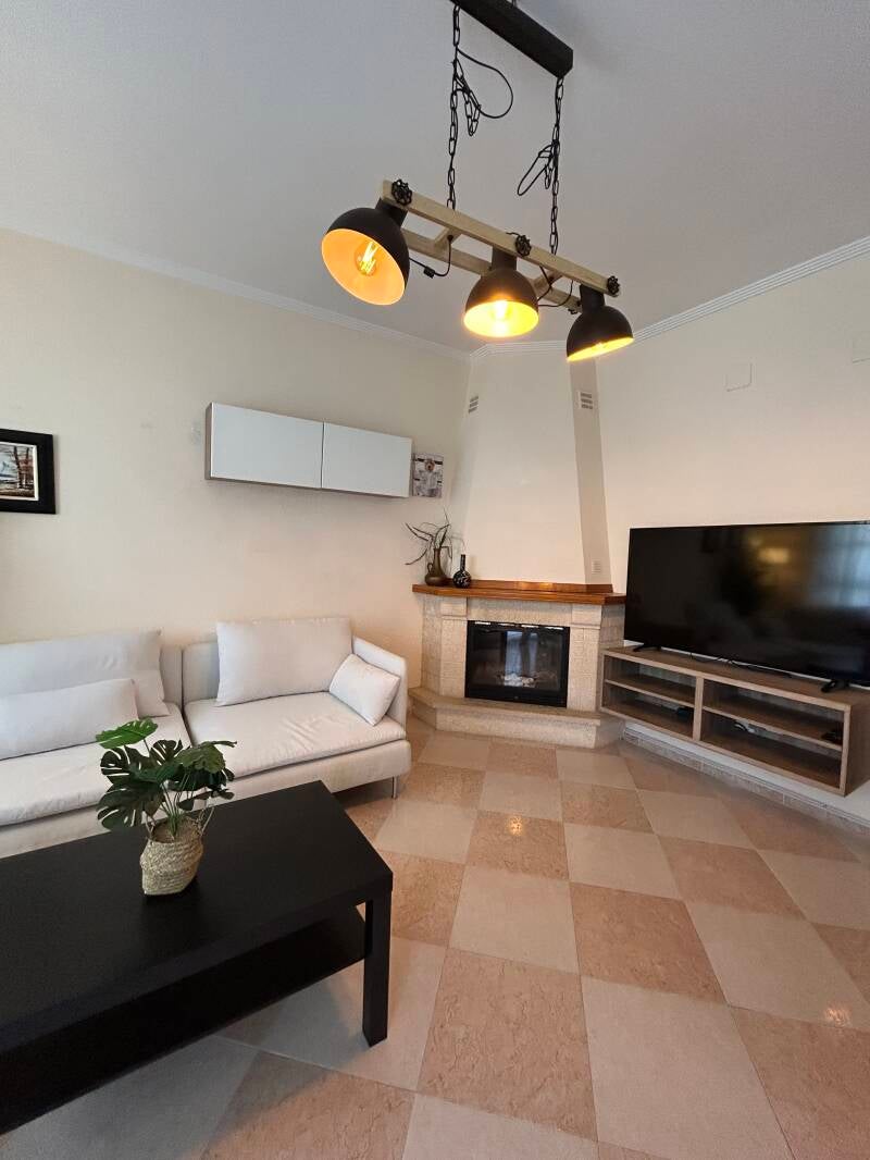 Subimos a la primera planta y encontramos un luminoso y completo salón con aire acondicionado y chimenea, con una pequeña terraza. Seguimos y encontramos un baño, una habitación individual con caldera y una cocina funcional, completa y amueblada con zona lavadero apartada.