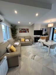 El alojamiento posee capacidad para hasta 10 personas y cuenta con 3 plantas: en la planta baja se sitúa la amplia terraza descubierta y otra terraza cubierta y luminosa ideal para almorzar o desconectar. Se conecta directamente con un enorme salón con aire acondicionado y Televisión con brazo para verse desde cualquier ángulo de la casa. Aseo completo con plato de ducha y cocina completamente amueblada y funcional, la cual conecta con un cuarto lavadero. En la planta de arriba encontramos la habitación principal con baño en suit y con un enorme ventanal que hace que nos adentremos en el mar gracias a las maravillosas vistas. Asu lado, otra habitación con cama de matrimonio, una tercera habitación con dos camas individuales y un baño completo. Por último encontramos un sótano, donde hay un salón amplio y abierto, ideal como zona de juego de niños o como zona de trabajo, con sofá cama de matrimonio y otra habitación de 2 camas individuales.